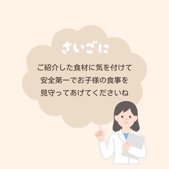 これらの食材に気をつけ、安全第一でお子さまの食事を見守ってあげてくださいね。。